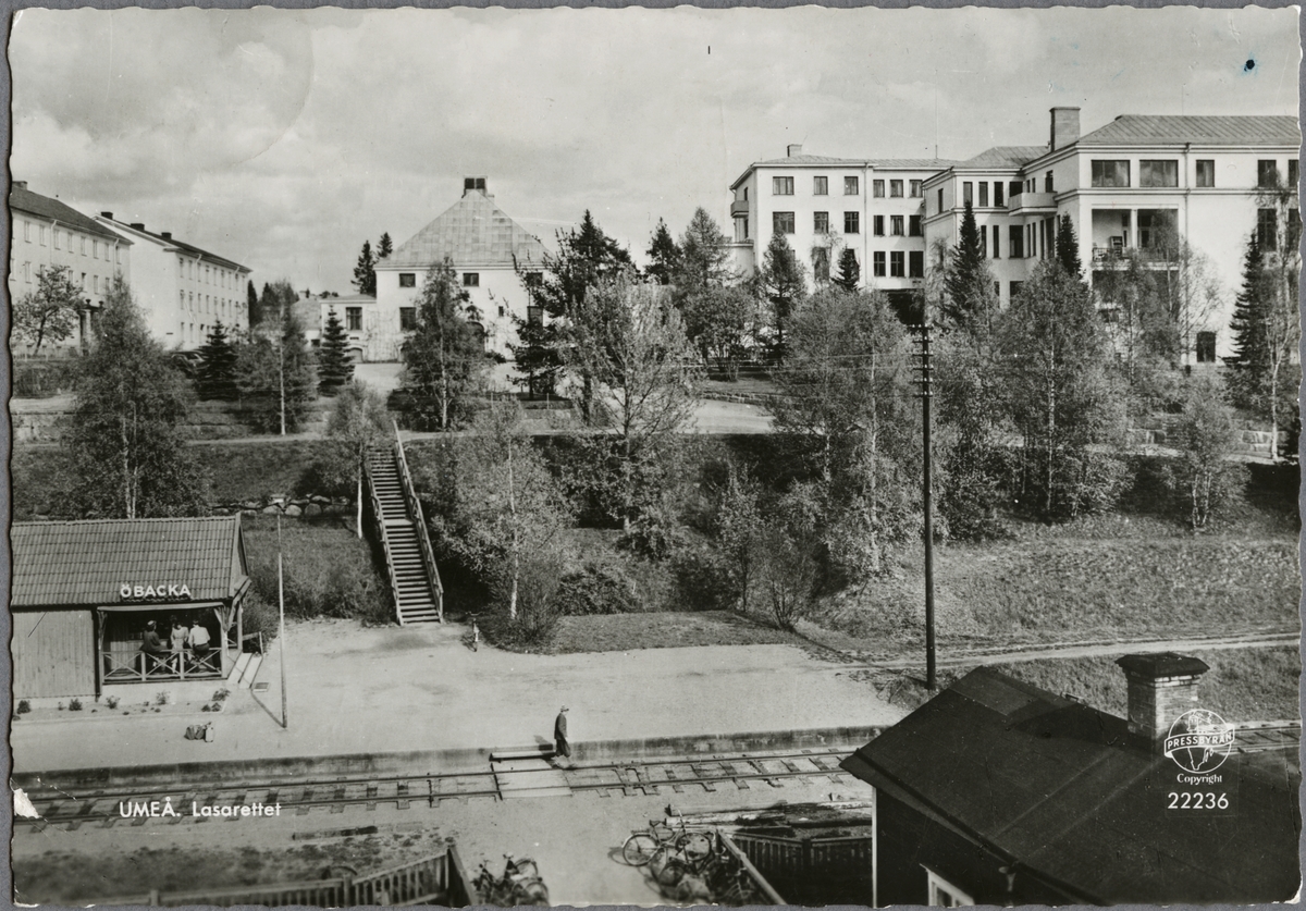 Titel: Öbacka station med Umeå lasarett i bakgrunden.