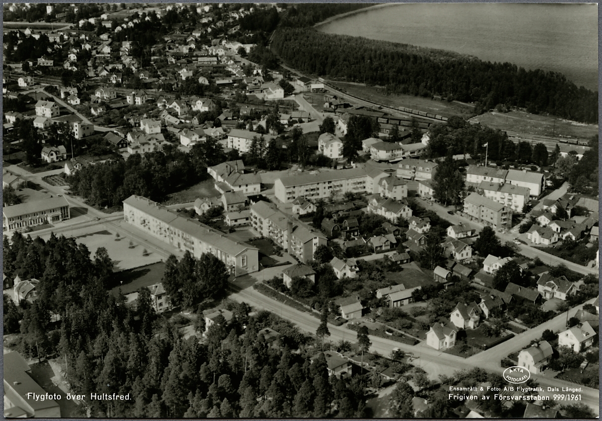 Flygbild över Hultsfred med stationsområdet i överkant vid sjön.