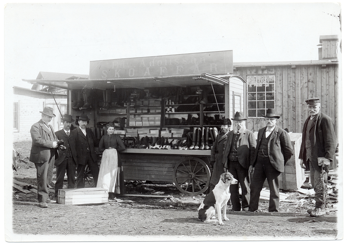 Luossavara skoaffär nere vid järnvägstippen vid Luossajokki år 1900. De 4 personerna trån höger sett heter Landström,Wiklander,Lundahl,Hagberg i efternamn.