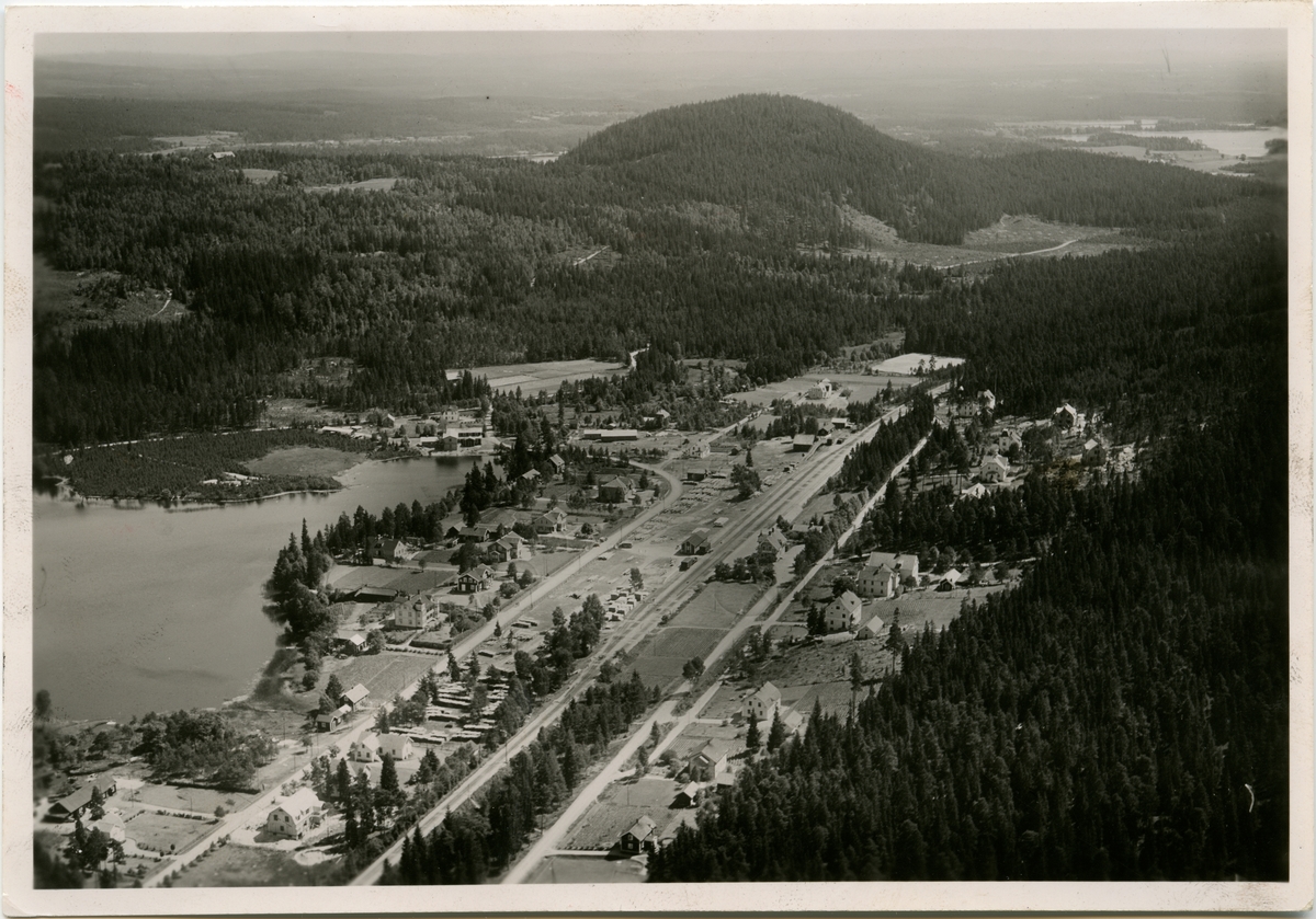 Flygfotografi över Hestra järnvägsstation med Isaberg. Station anlagd 1902.