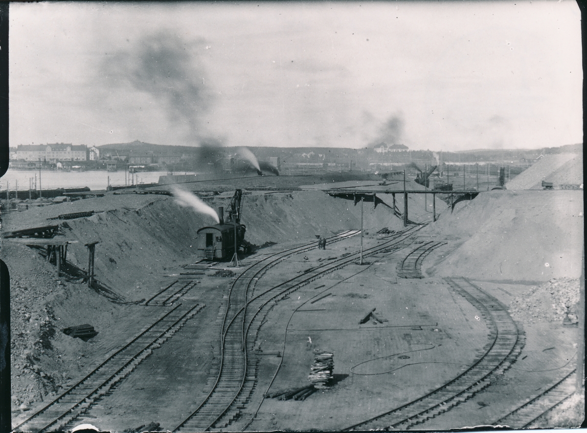 Malmupplag i Luleå station. 1888-03-12 det första malmtåget kom ned till Luleå. Stationshuset färdigtbyggdes 1887. Exploateringen i malmgruvorna började öka. Kapaciteten har successivt också ökat genom förstärkning av bana, broar, mötesstationer och elektrisk drift. Malmbanan byggdes av Sverige & Norges Järnväg. Ångdriven kran.