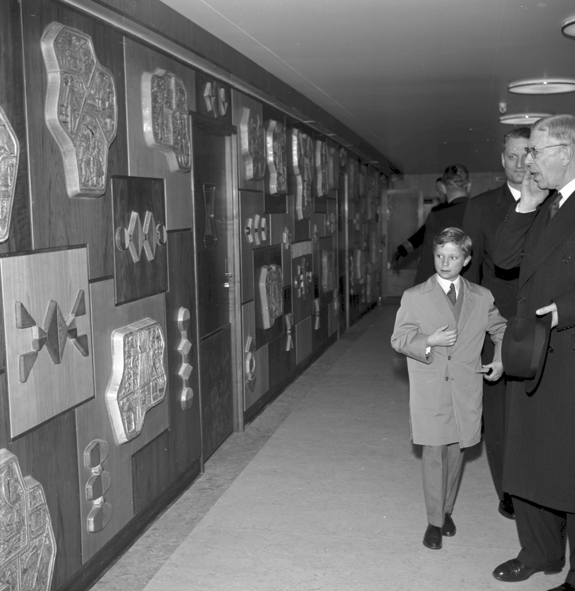 Kungabesöket på tågfärjan "Trelleborg" i Stockholm, Gustav IV Adolf och kronprins Carl Gustaf sedemera Carl XVI Gustaf. Generaldirektör Erik Upmark