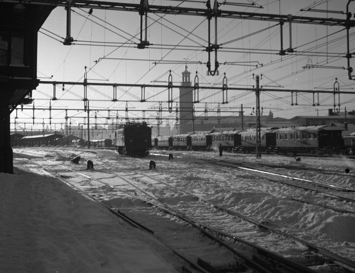 Bangården, Stockholm C, sedd från norra sidan. Stadshuset i bakgrunden.