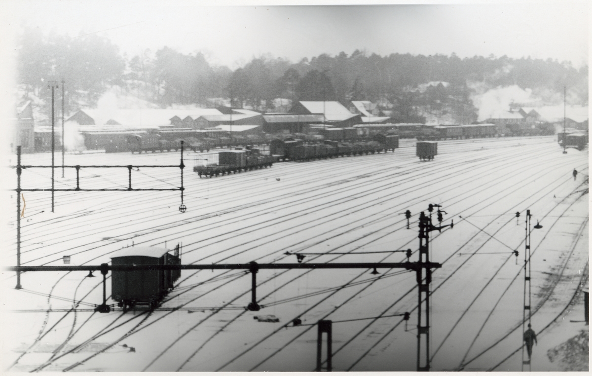 Delvis elektrifierad bangård. Tomteboda vagnverkstad till vänster.