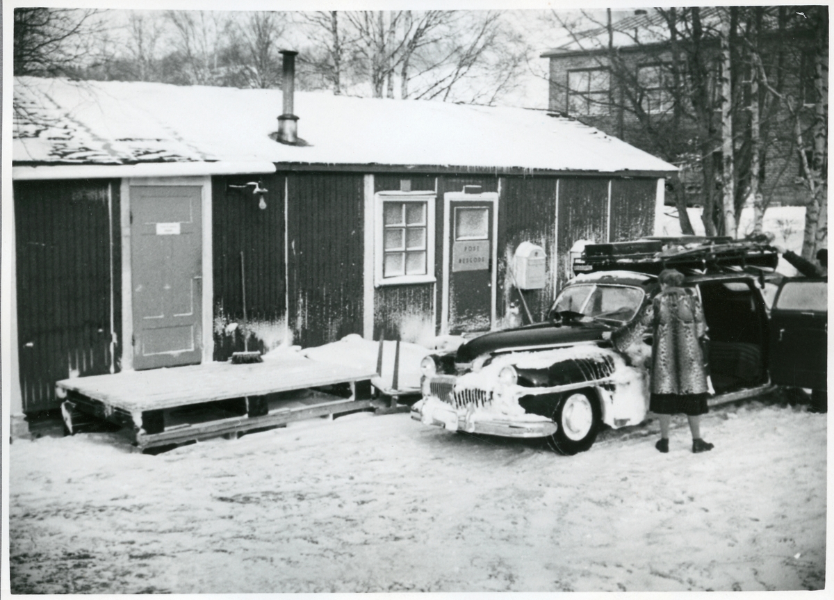 Personbil framför post- och resgodsbyggnad i Undersåker.