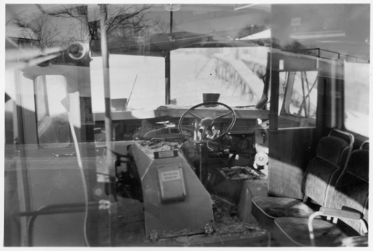 Förarplatsen på krockskadade bussen Statens Järnvägars, SJ buss 1985.