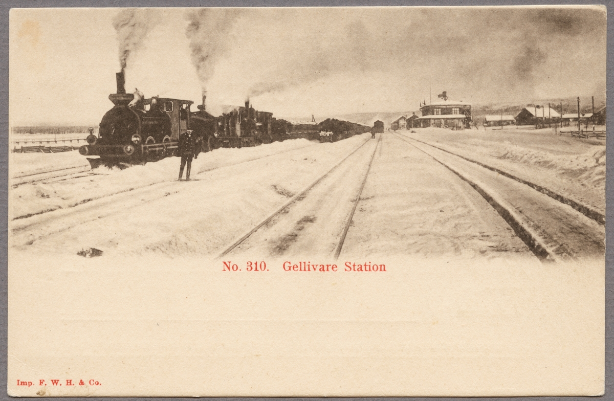 Vy på stationsbangård under vintertid med lok och vagnar i bild och stationshus i bakgrunden.