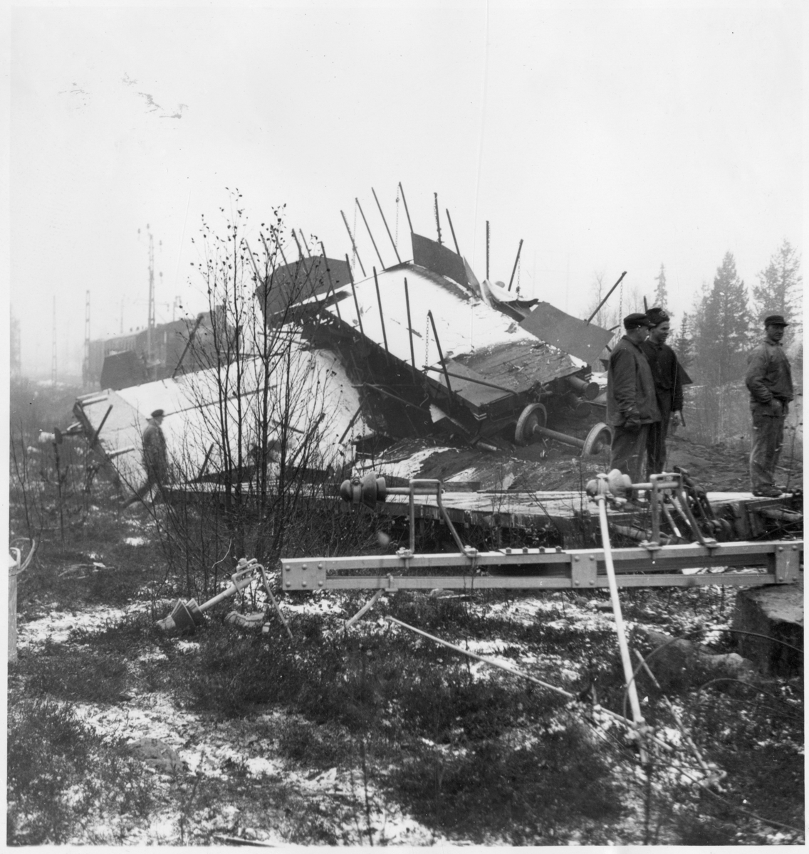 Vy på olycksområde efter urspårning med personal och vagnar i bild mellan Håmojåkk och Linaälv.