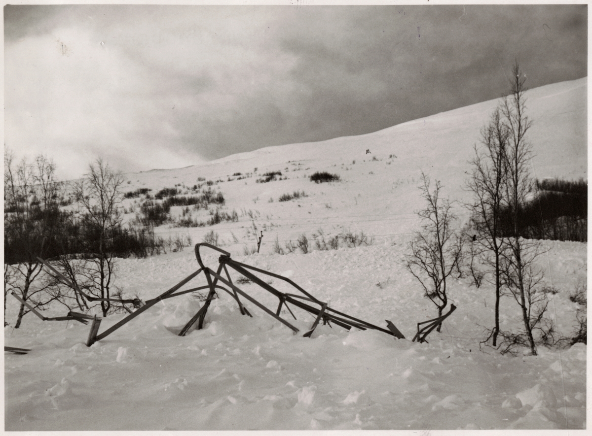 Rester av kontaktledningsstolpe efter snöskred.