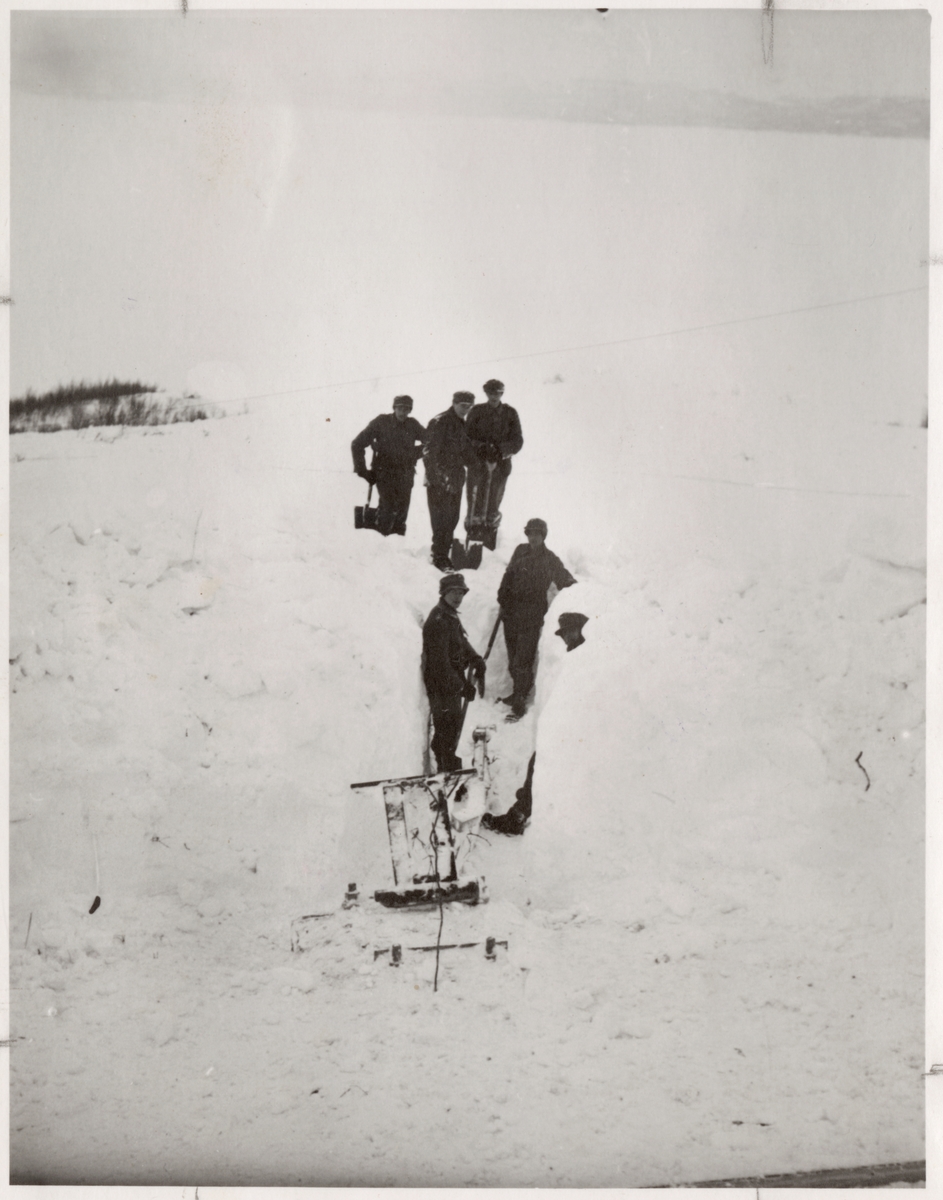Personal gräver fram en kontaktledningsstolpe efter snöskred.