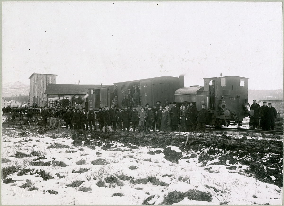 Rälsläggning framkommer till Kiruna 1899. På bilden ser vi ånglok SJ Qå 446, före detta Sverige & Norge Järnväg S&NJ lok 16, godsvagn 5769. På bilden ser vi bland annar avdelningsingenjör E.Holmgren, Doktor ? med fru, arbetschef C G Höjer.