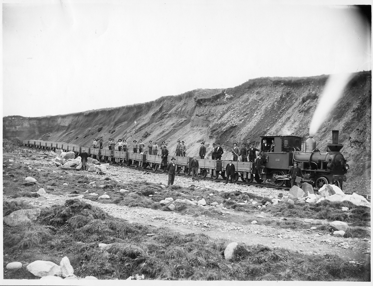 Grupporträtt. Norra Östergötlands Järnväg, NÖJ lok 5 "Glan". Loket tillverkades 1884.