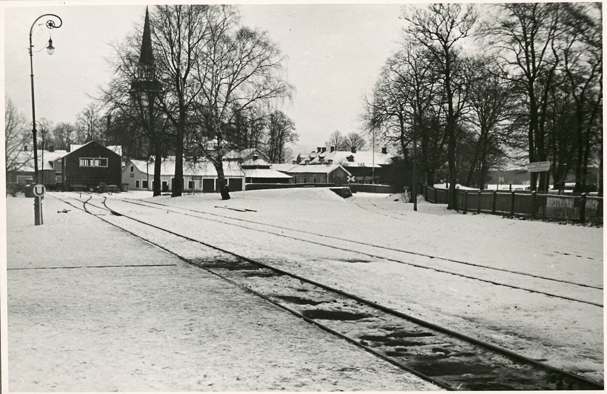 Del av stationsområdet i Mariefred. Till vänster i bild syns godsmagasinet.