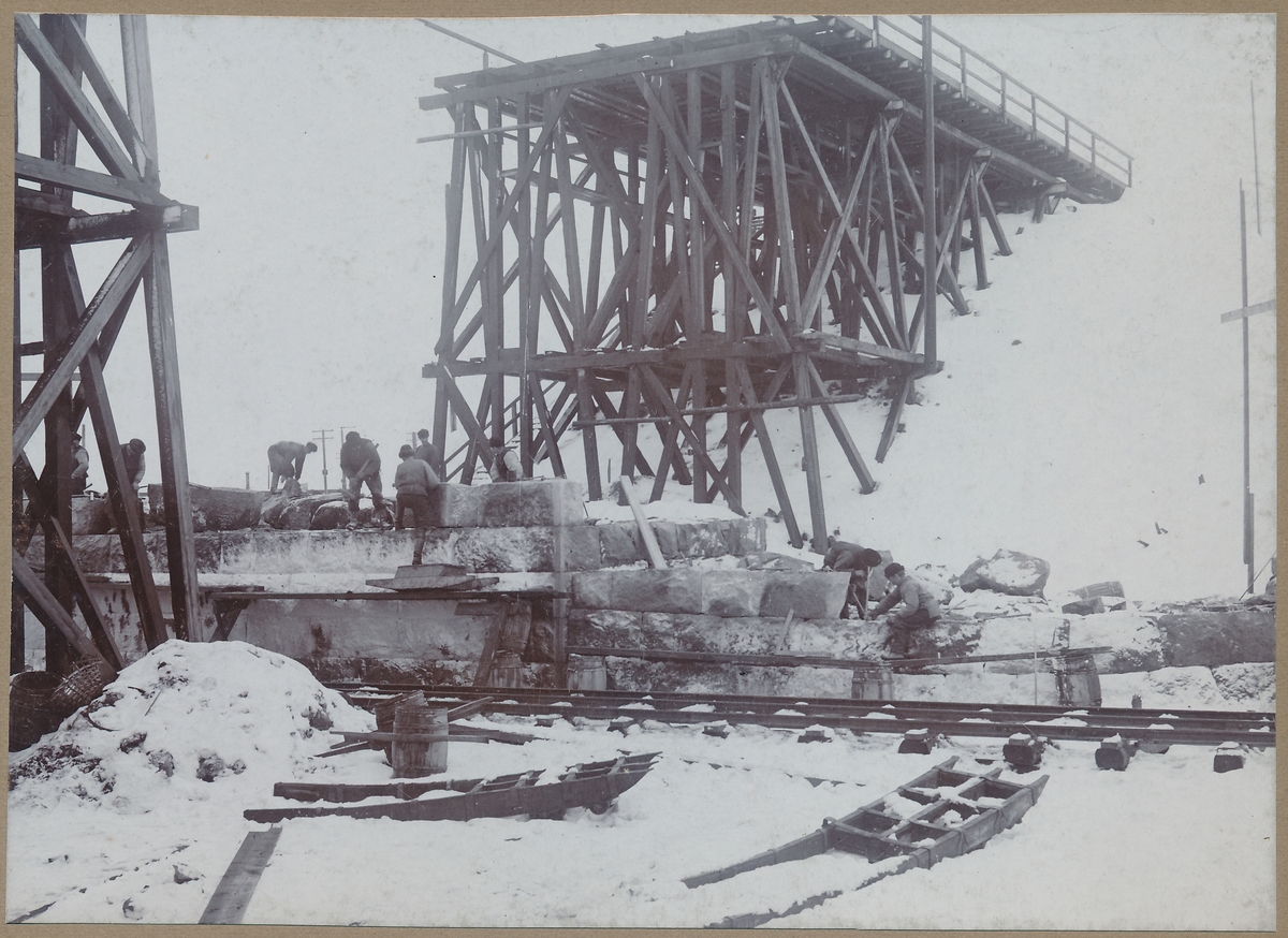 Ombyggnad av malmutskeppningsbryggan på Svartön invid Luleå. Vintern 1906-1907. Anordnande an landfäste i samband med ombyggnaden