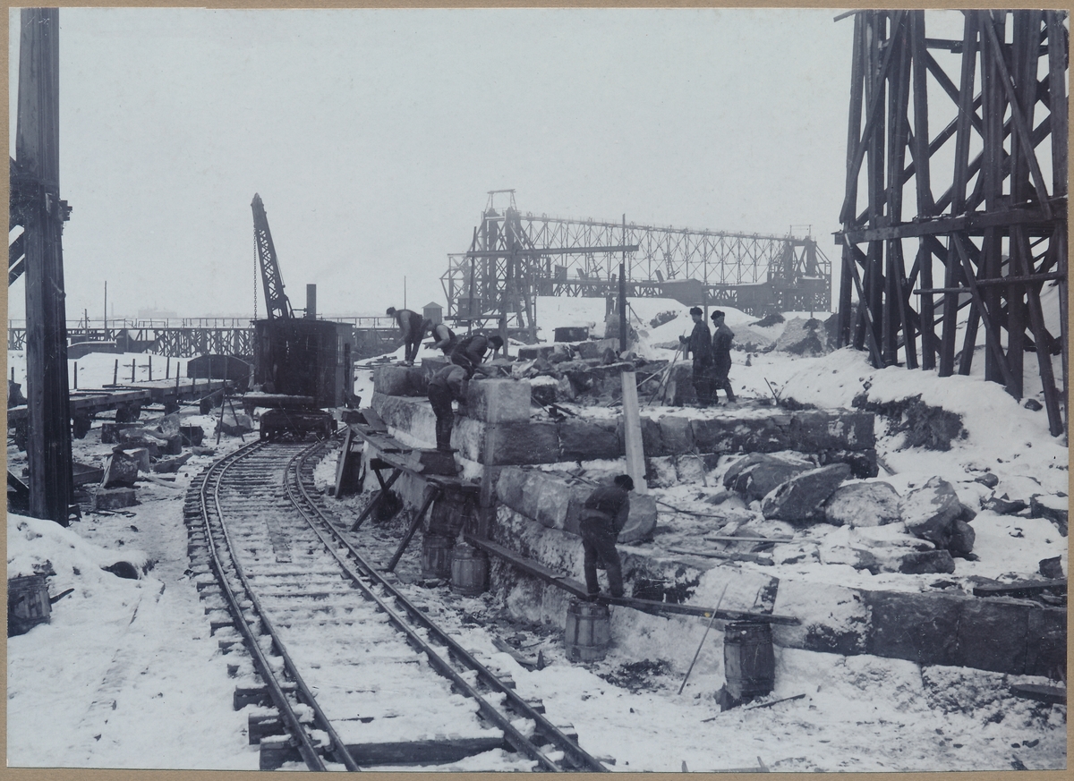 Ombyggnad av malmutskeppningsbryggan på Svartön invid Luleå. Vintern 1906-1907. Anordnande an landfäste i samband med ombyggnaden. Ångdriven kran.