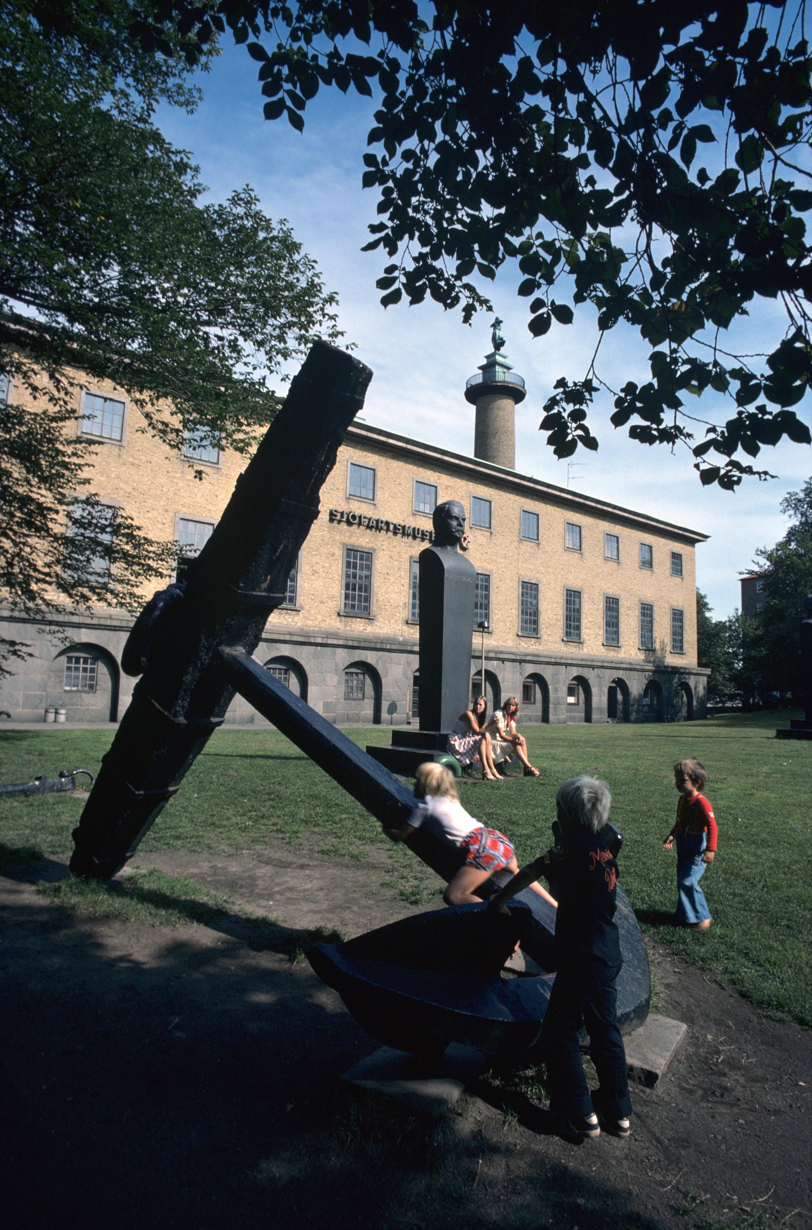 Ankare, lekande barn och byst över Dan Broström i förgrunden. Bakom Sjöfartsmuseet syns statyn Kvinna vid havet.