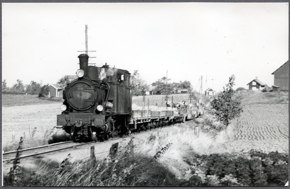 Godståg med ånglok i närheten av Norrköping. Norra Östergötlands Järnvägar, NÖJ lok 12. Loket är tillverkat av Nohab 1908 för spårvidd 891mm. 1950 efter förstatligandet fick loket nytt nummer Statens Järnvägar, SJ S27p 3174.