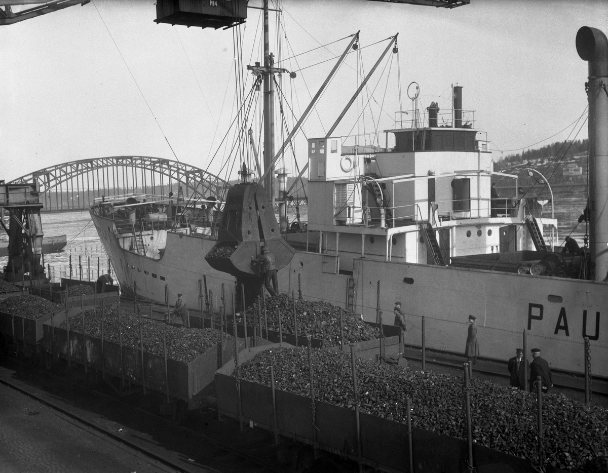Lossning av kol i Hammarby hamn. Årstabron i bakgrunden.