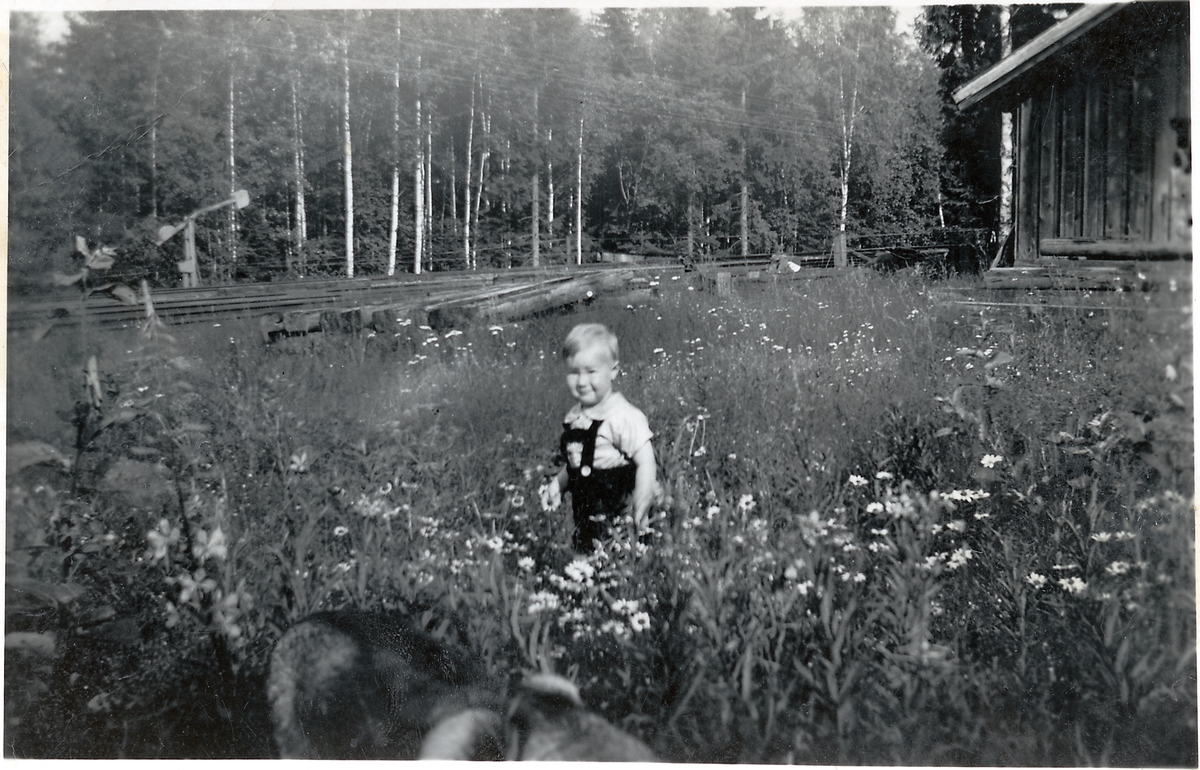 Björn med familjen Anderssons hund på blomsterängen. Järnvägen syns i bakgrunden.