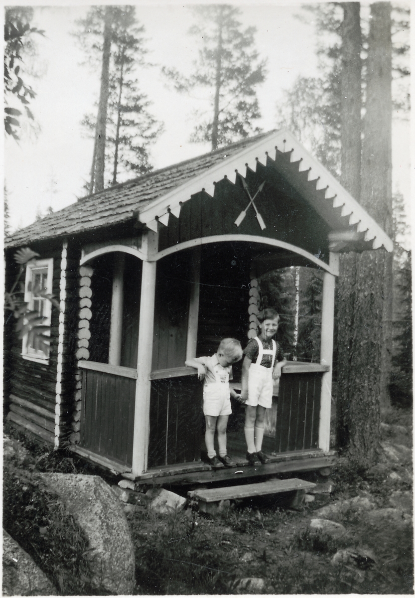 Vid lekstugan i Långsjön: bröderna Göran och Björn Aldenby. Söner till Lisa och Ingemar Aldenby.