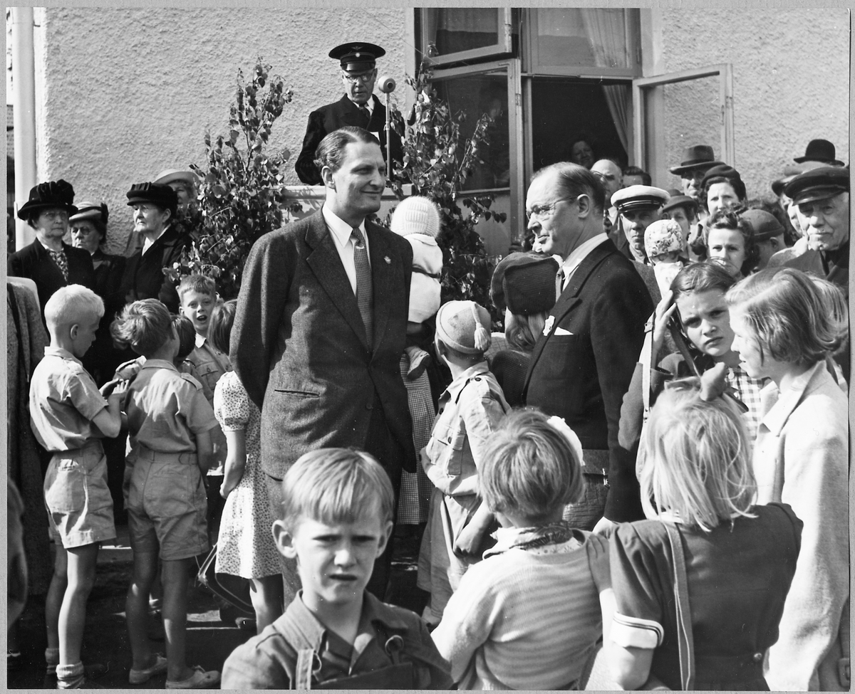 Elektrifieringsinvigning av banan Borås-Strömstad. Här görs ett stopp i Lysekil där Ordförande i Statsfullmäktige ska hålla tal, i mitten syns Generaldirektör Erik Upmark.