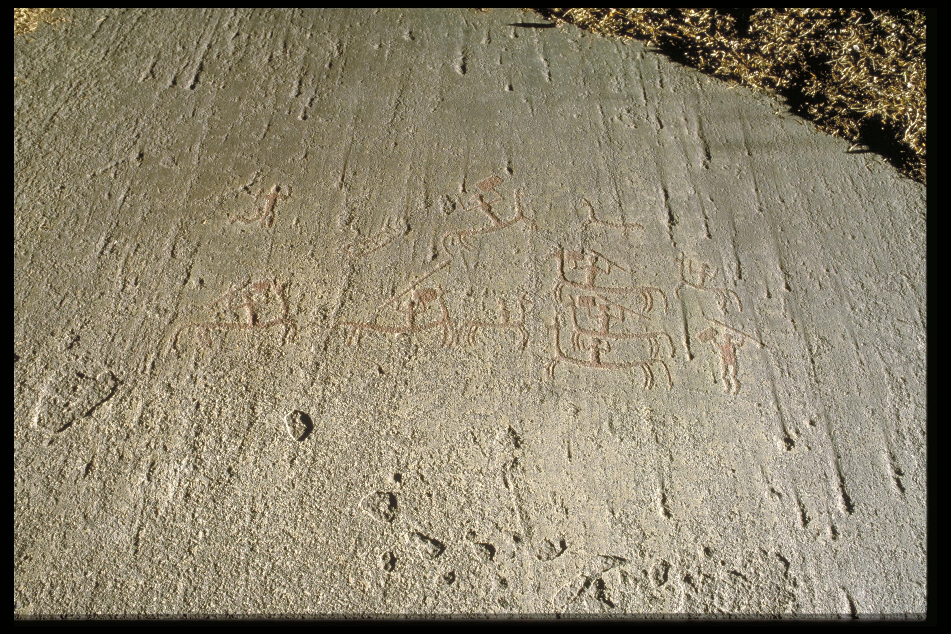 Ryttarscen, människofigur med spjut och sköld. I förgrunden exfoliering. Tanum 72:4.