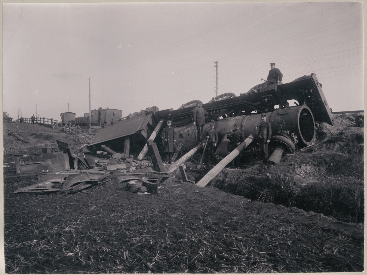 Urspårat lok efter tågolycka med personal och vagnar i bild på linjen mellan Älmhult och Killeberg.
