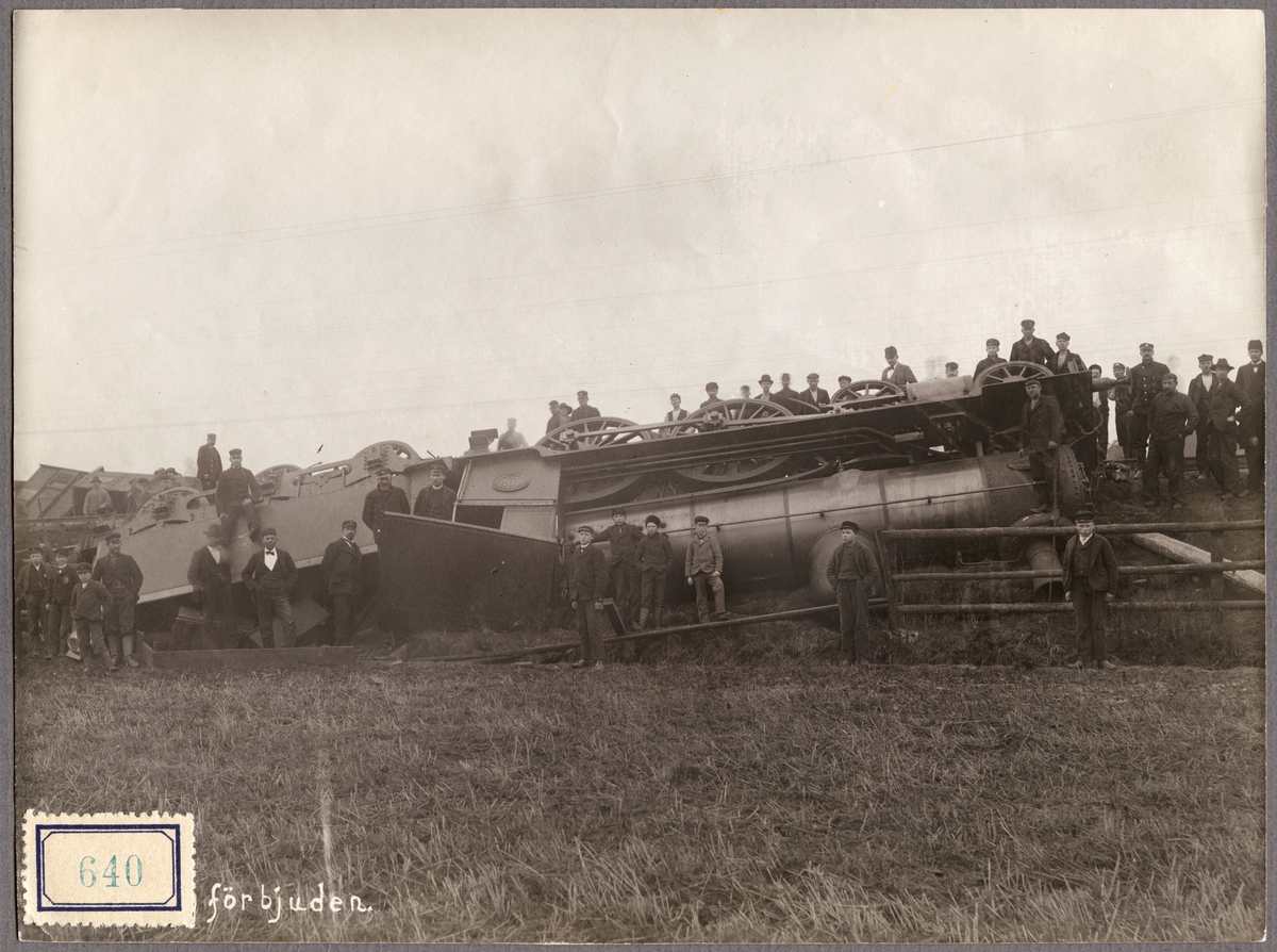Personal vid urspårat lok med tender på linjen mellan Älmhult och Killeberg.
