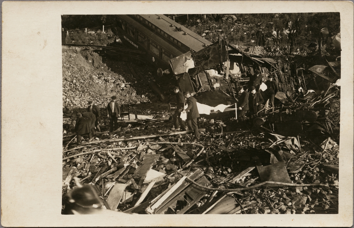 Titel: Tågolycka vid Getå den 1 oktober 1918 där bland annat, Statens Järnvägar, SJ F 1200 rasade nedför slänten efter ett banvallsras.
