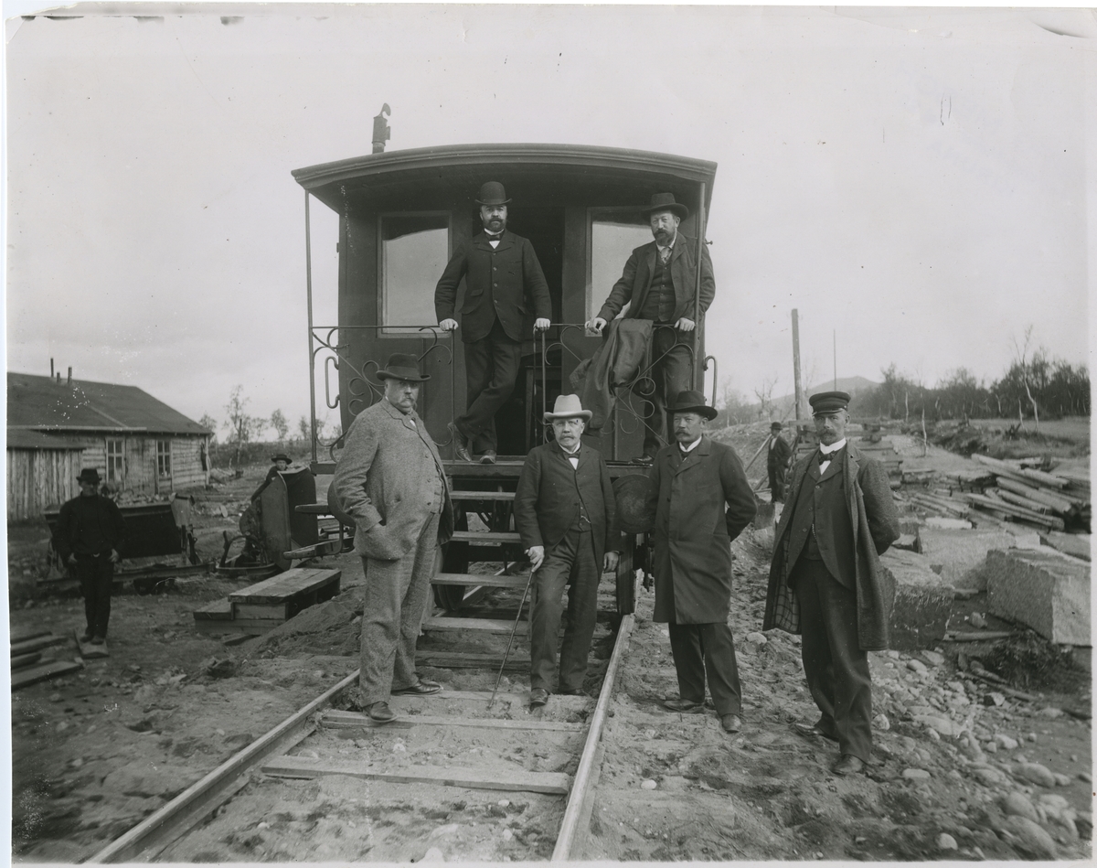 Disponent Lundbohm med flera poserar framför personvagnen. I bakgrunden syns Luossavaara.