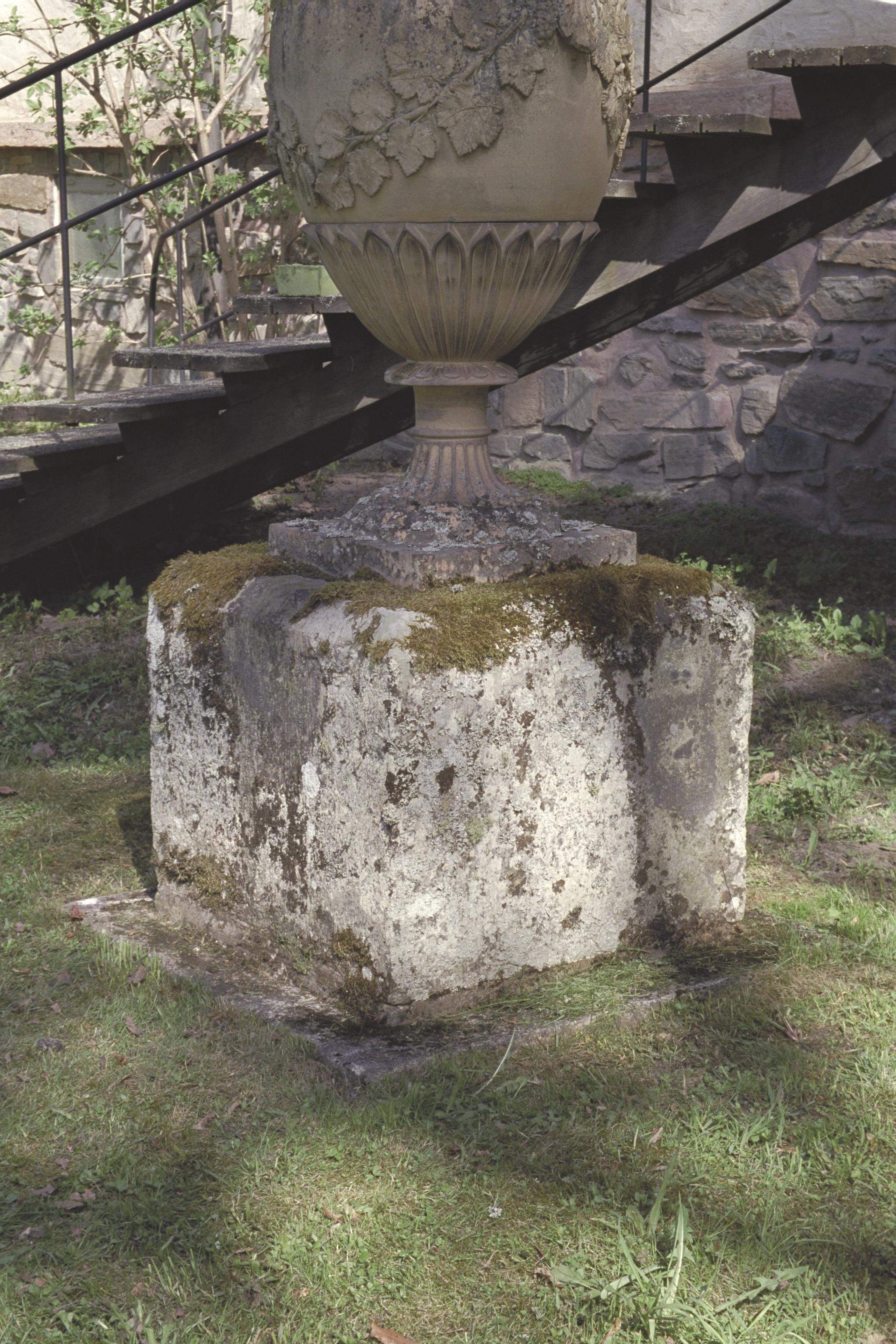 Urnan vid huvudbyggnadens västra fasad. Urnans postament.