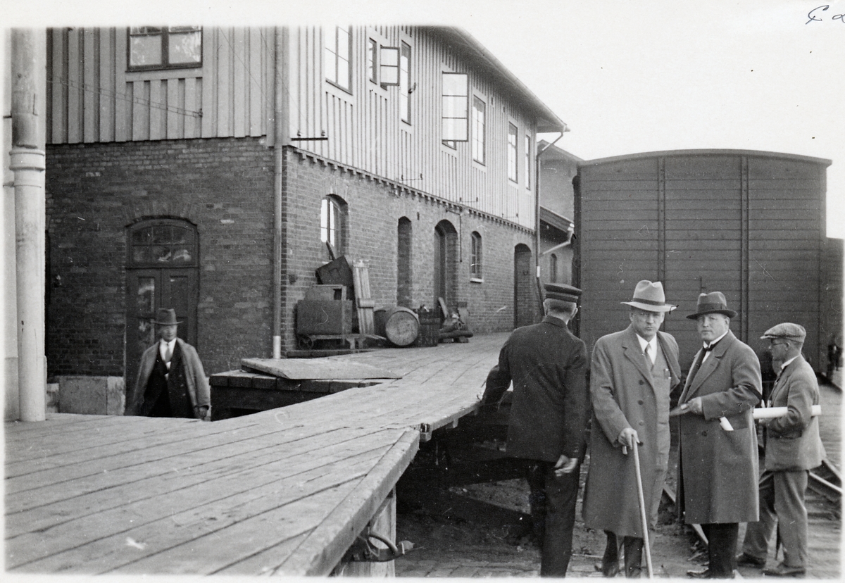 Järnvägspersonal med flera herrar på vandring runt stationsområdet i Jönköping.