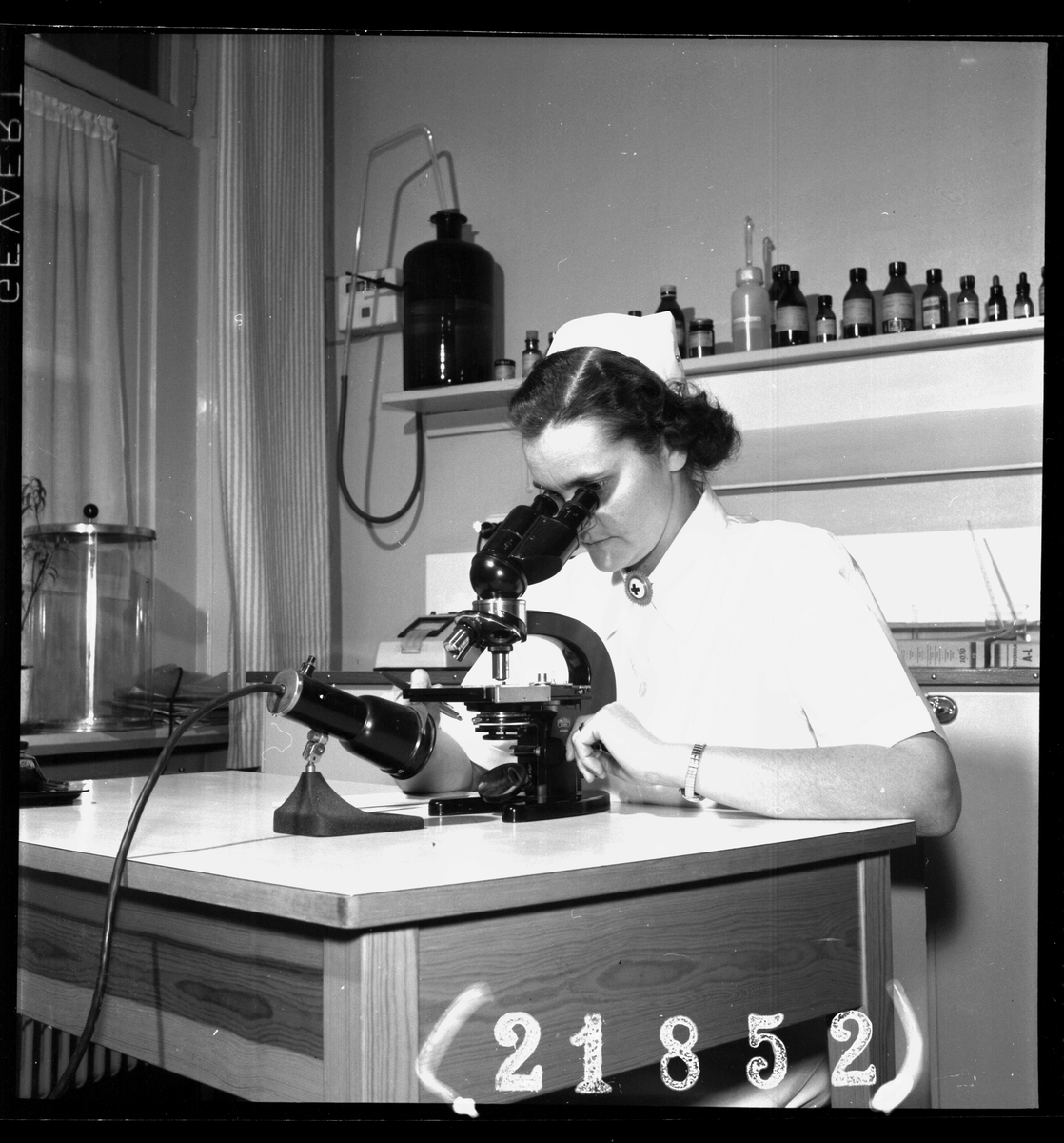 Titel: Läkarmottagning. Syster Birgit vid mikroskop.