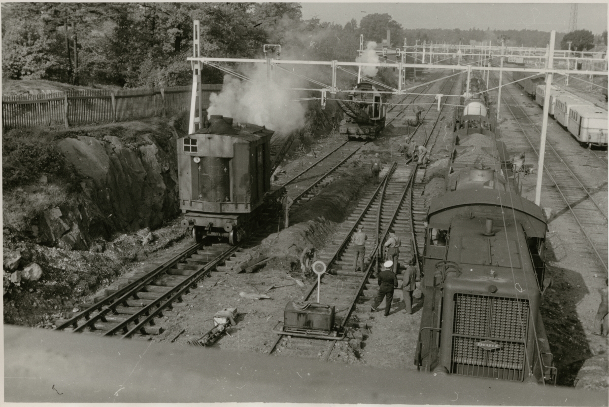 Montering av spårväxlar på Oxelösunds bangård med två ångkranar till hjälp.