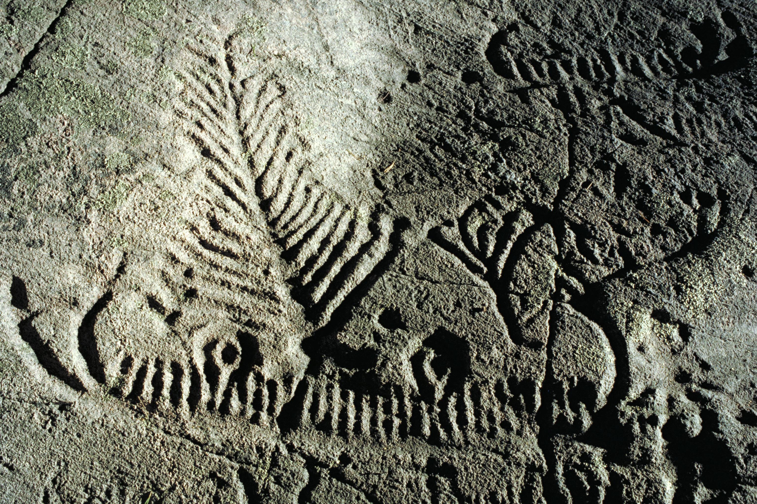 Skepp och gran- eller ormbunkes-liknande trädfigur.