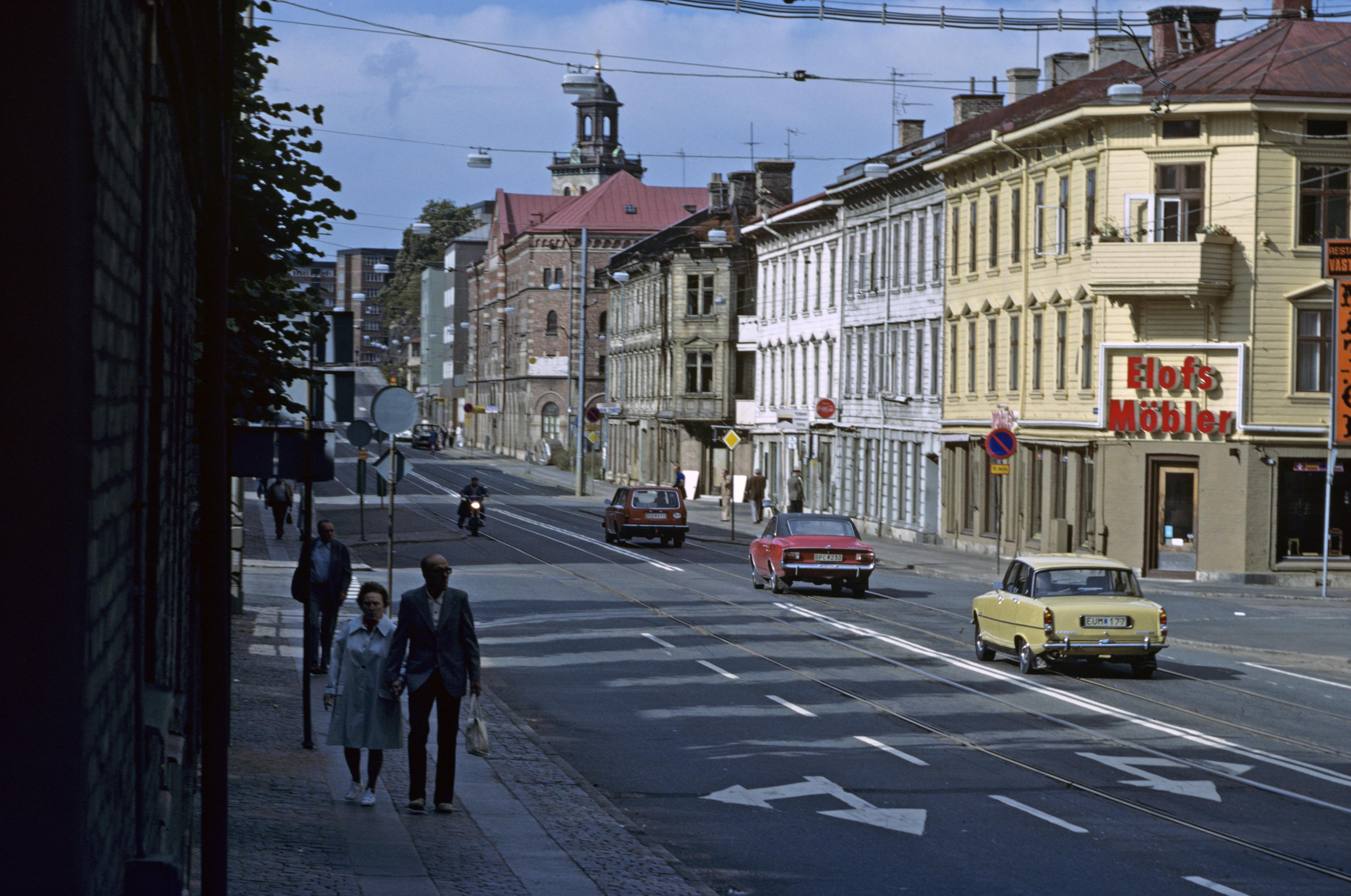 Gatubild med byggnader i olika nystilar. Carl Johans kyrka i bakgrunden.