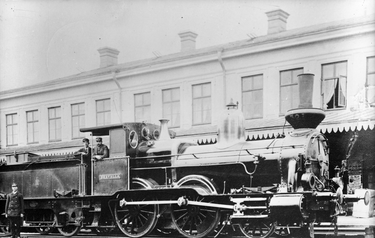 Statens Järnvägar, SJ Da 321 "Bråvalla" vid Motala järnvägsstation. "Bråvalla" byggdes av Motala Verkstad och levererades 1883, bilden är troligen tagen vid denna tidpunkt.