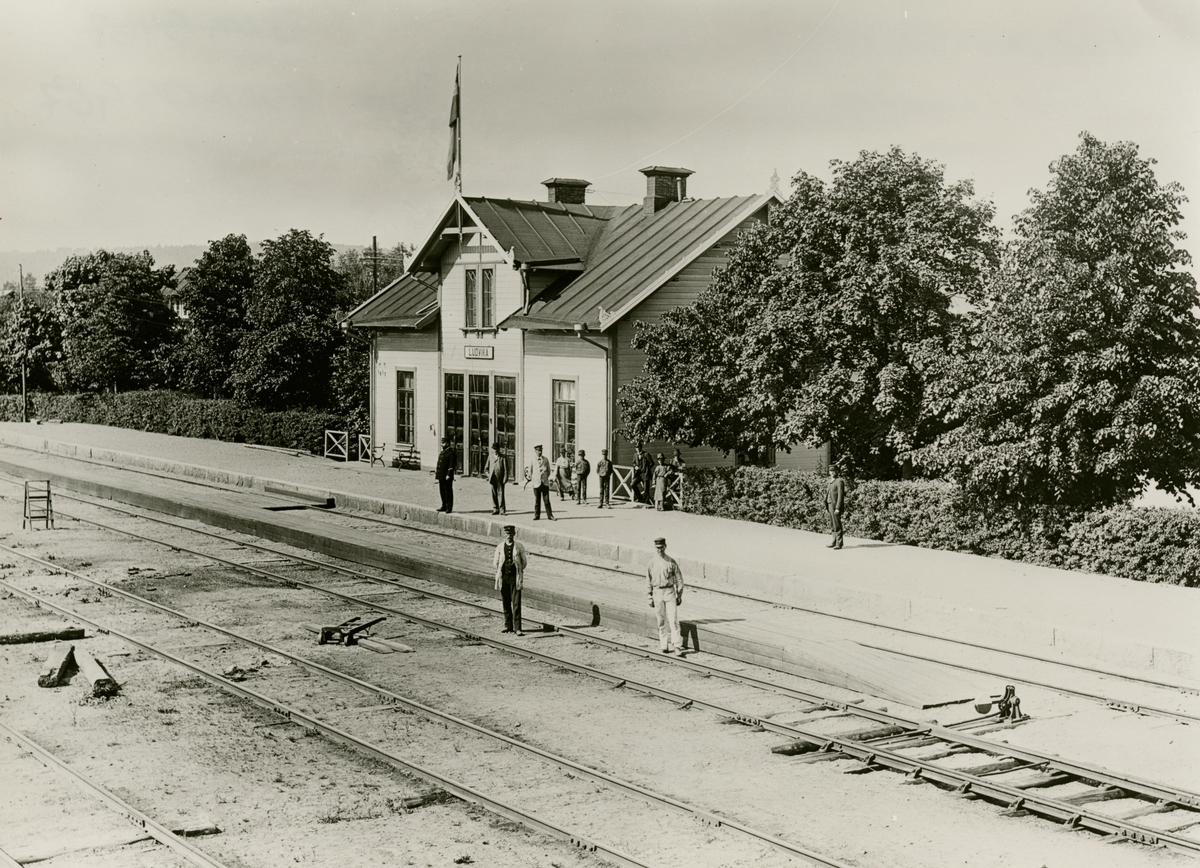Titel: Frövi - Ludvika Järnvägs, FLJ stationshus. Stationshuset slopades 1903-05-01 då FLJ, Stockholm - Västerås Bergslagens Järnvägar, SWB samt Bergslagernas Järnvägar, BJ, kom överens om att gemensamt använda BJ stationshus.