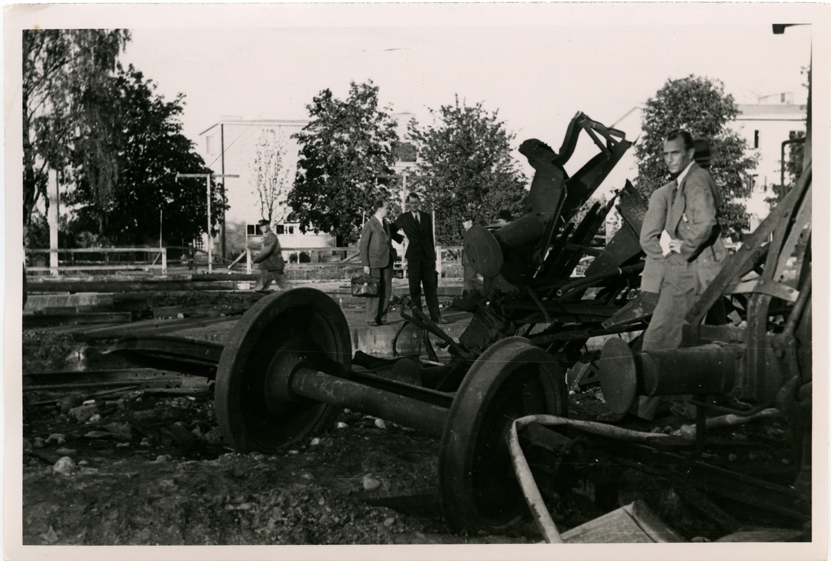 Krylbo-olyckan. Förvridna vagndelar och räls inspekteras. Lägenhetshus i bakgrunden.