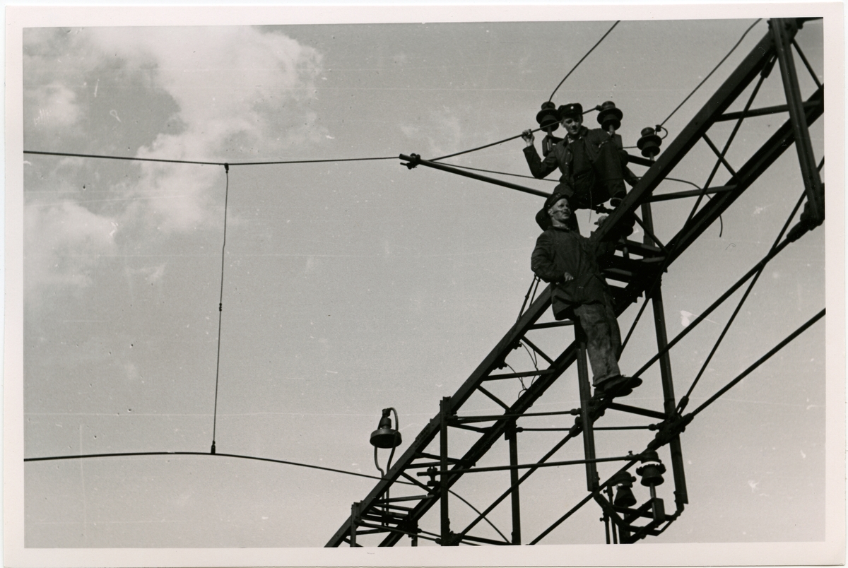 Krylbo-olyckan. Personal inspekterar kontaktledningsbryggan.