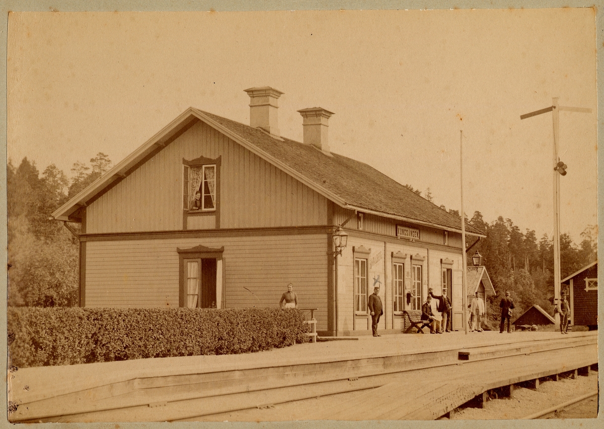 Kungsängens järnvägsstation. Mannen till vänster var Otto Lindbohm, född 1845 och som var stationsinspektor på Kungsängens järnvägsstation 1876-1909. Kvinnan som tittar ut genom fönstret hette Karin.