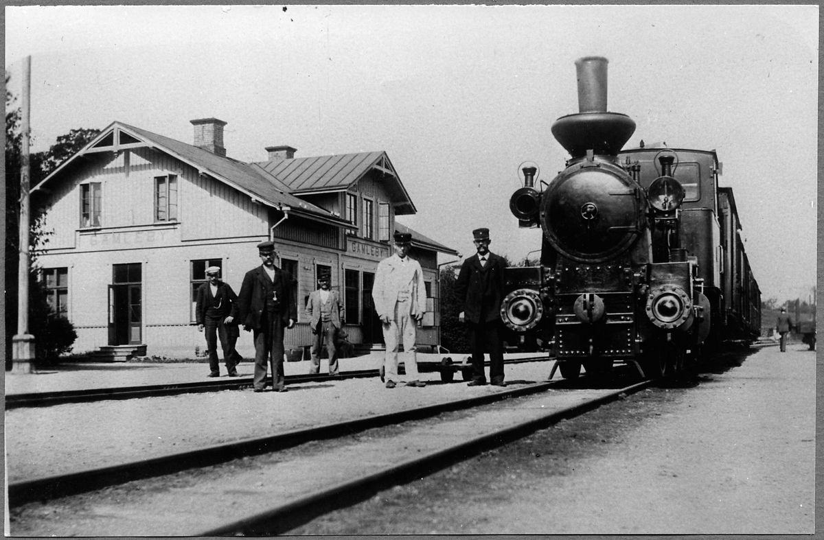 Persontåg och personal på bangården vid Gamleby station. WÅB lok 5 "Åtvidaberg", Westervik-Åtvidaberg-Bersbo järnväg.