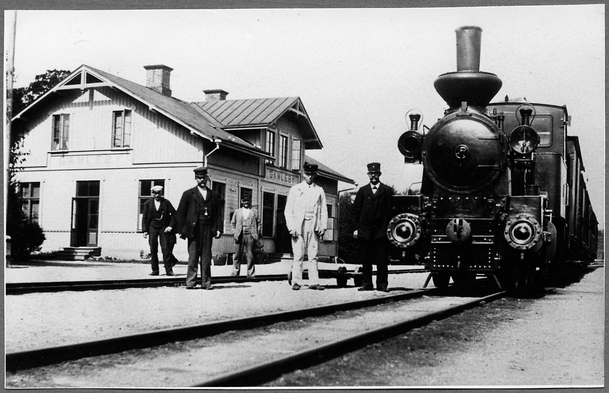 Persontåg och personal på bangården vid Gamleby station. WÅB lok 5 "Åtvidaberg", Westervik-Åtvidaberg-Bersbo järnväg.