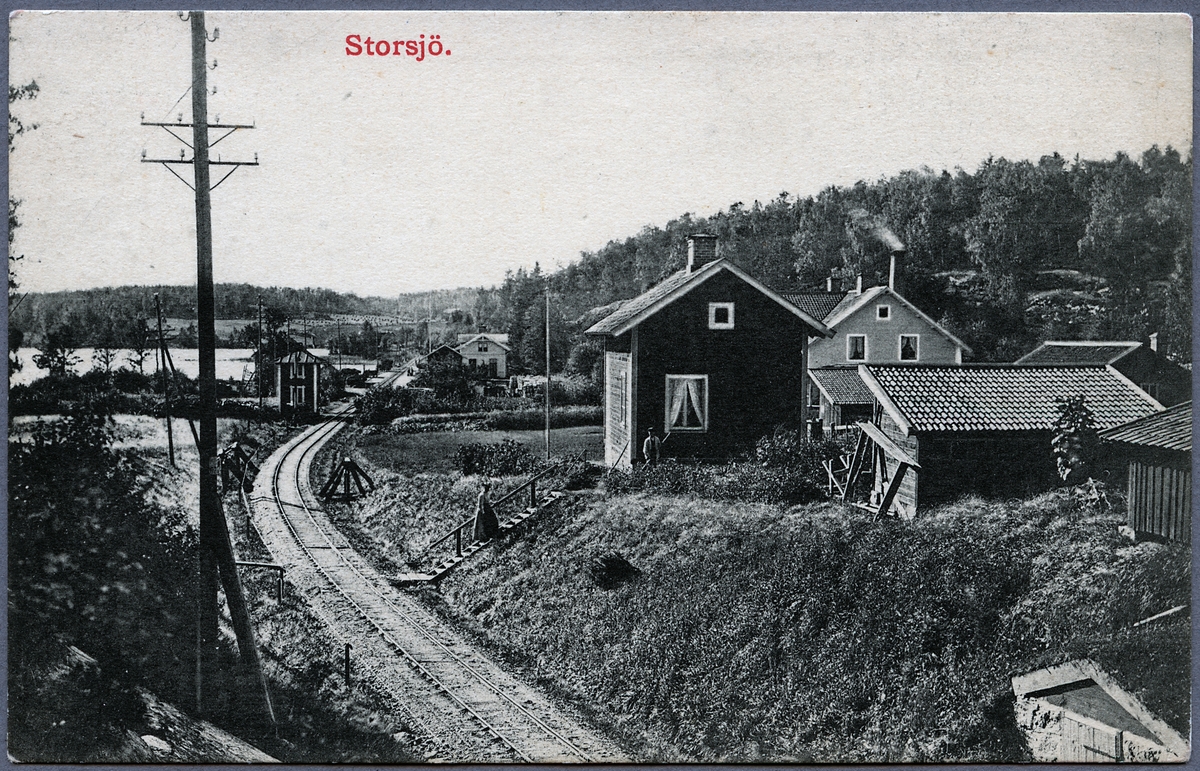 Vy över stationskarlbostaden, vattentornet och bangården i Storsjö.