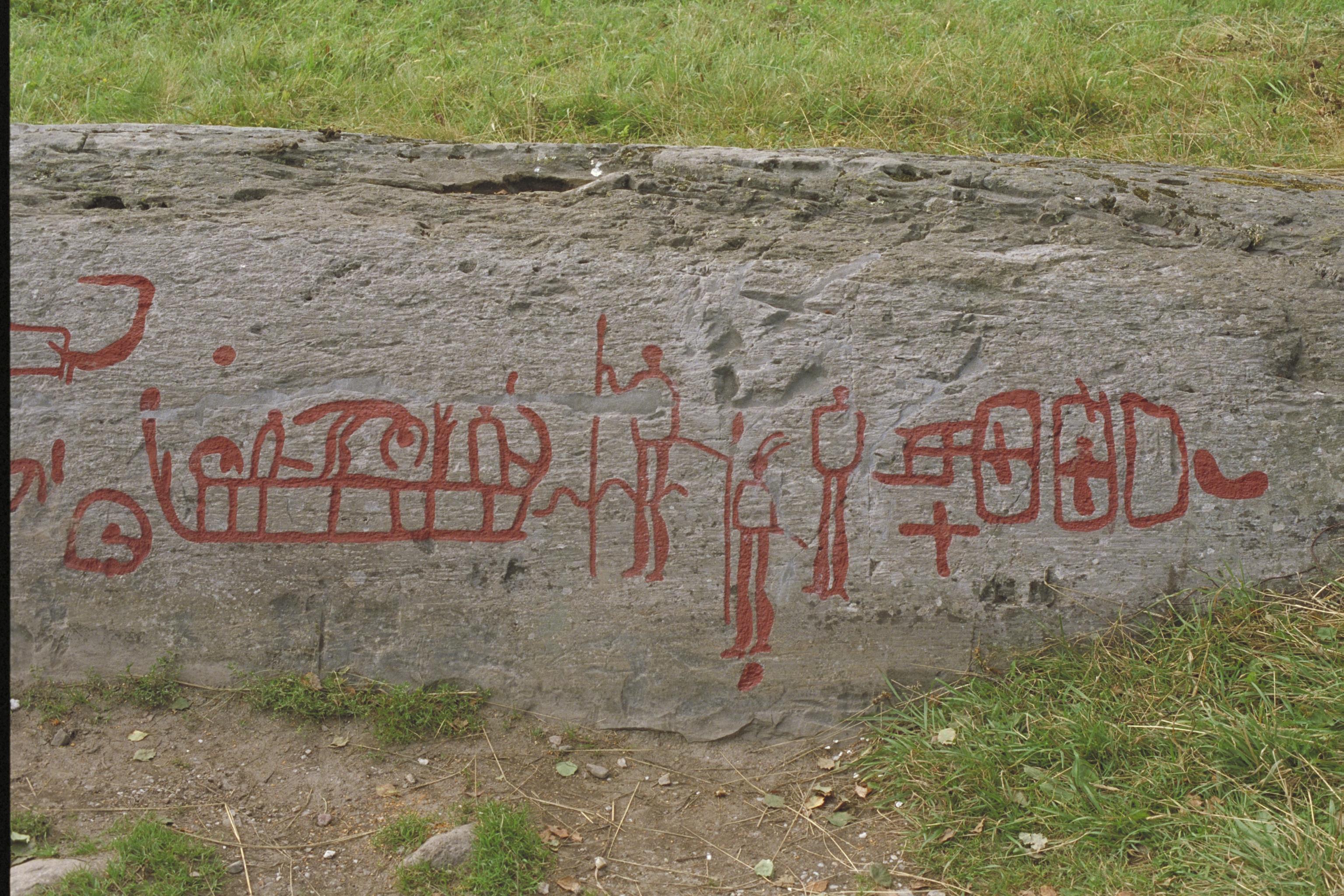 RAÄ-nummer Tisselskog 11:1. Processionshällen. Skeppsfigur med voltigör och människofigurer.