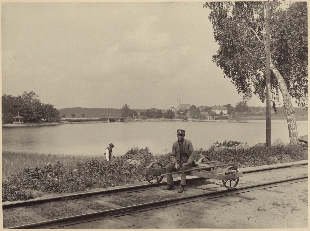 Frövi - Ludvika Järnvägar, FLJ personal på dressin där Lindesberg ses i bakgrunden.