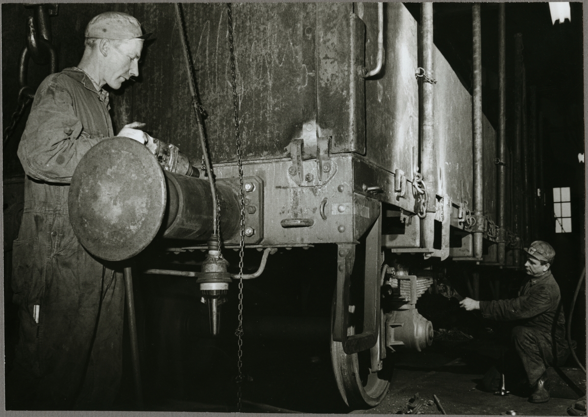 Ragnar Andersson och Carl Dahlén utför underhåll på godsvagn i Trafikaktiebolaget Grängesberg - Oxelösunds Järnvägar, TGOJ verkstad, Eskilstuna.