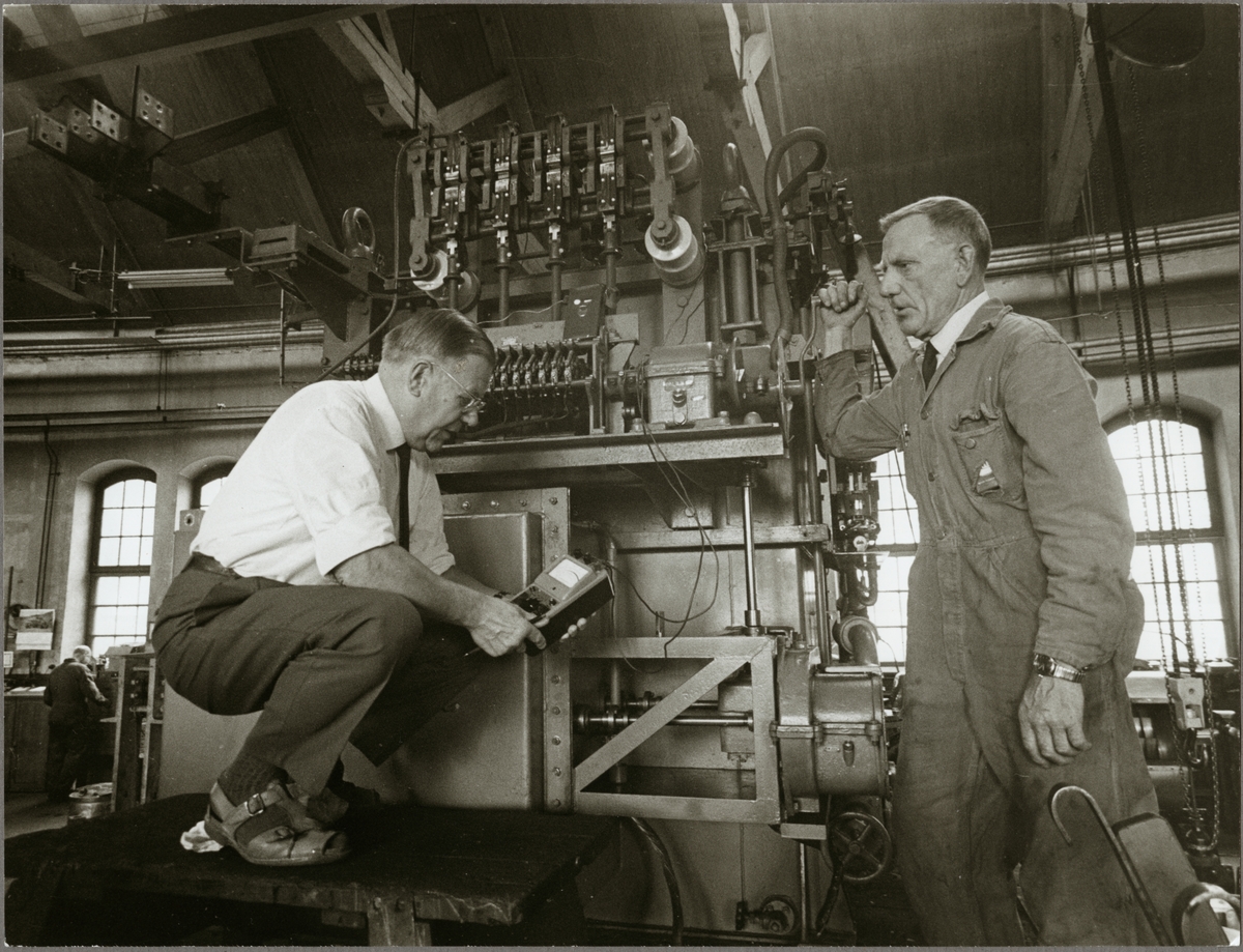 Förste Verkmästare David Pilstad och lagbasen Torsten Tollin kontrollmäter kampådraget i huvudtransformatorn.