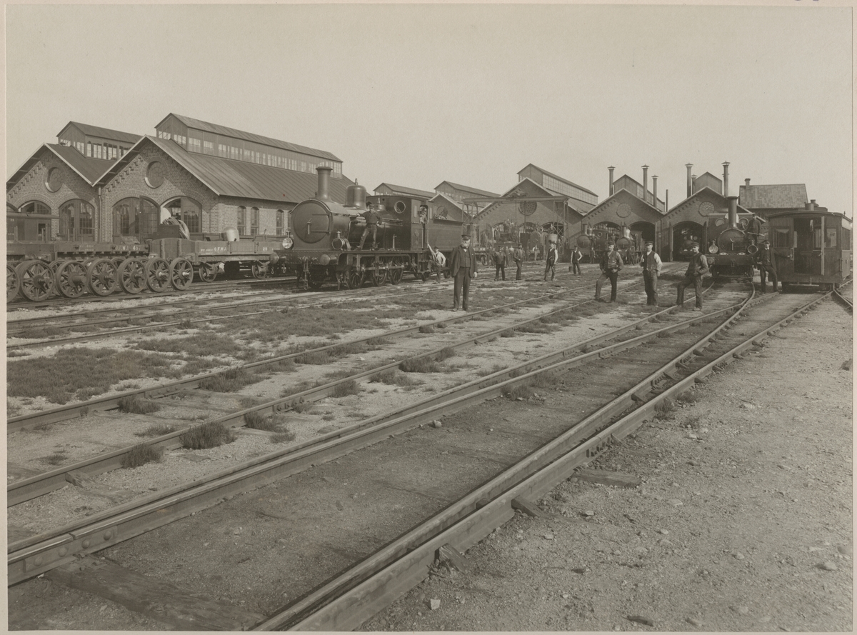 Oxelösund - Flen - Västmanlands Järnväg, OFWJ K 22 vid lokstallet i Eskilstuna. Längst till höger syns OFWJ ångvagn 1.