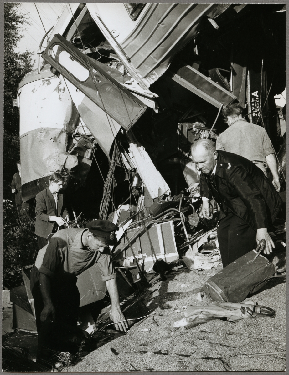 Uppröjningsarbete efter kollisionen mellan ett extratåg och ett rälsbusståg på linjen mellan Grycksbo och Sågmyra 1958. Statens Järnvägar, SJ YBo6 1097 i bild.